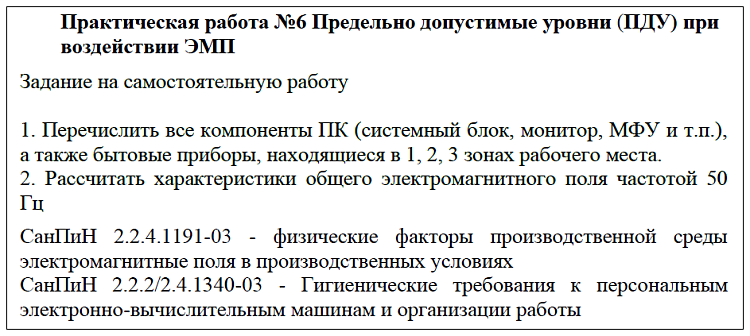 - Практическая работа №6. Предельно допустимые уровни (ПДУ) при воздействии ЭМП