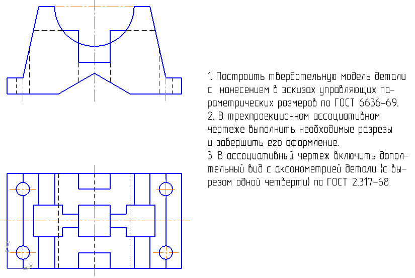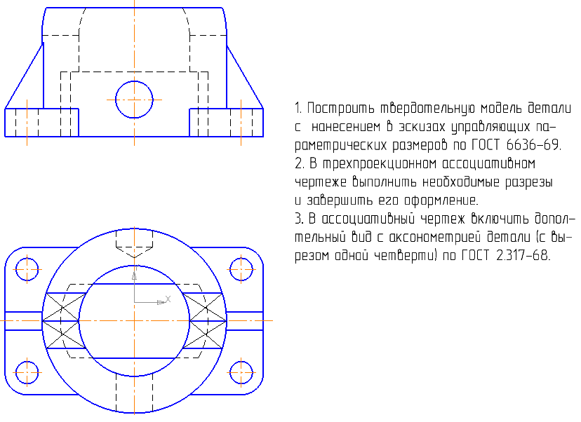 1. Построить твердотельную модель детали с нанесением в эскизах управляющих параметрических размеров по ГОСТ 6636-69.