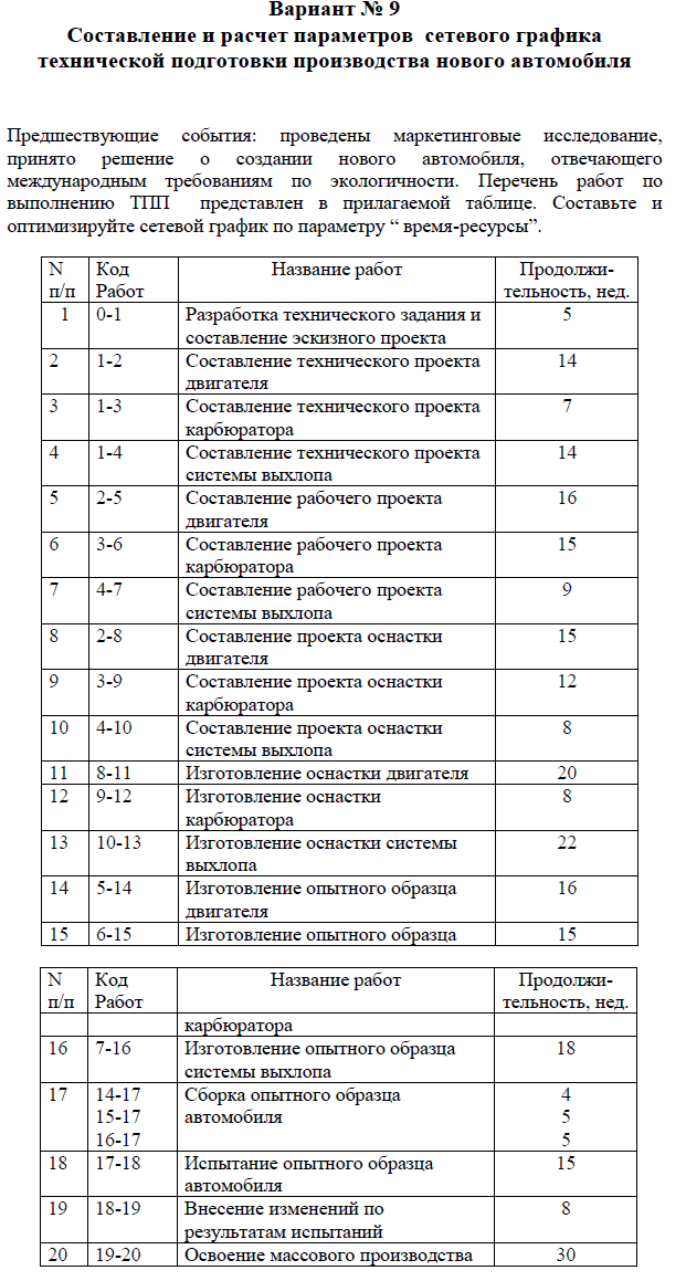 Тема: Составление и расчет параметров сетевого графика технической подготовки производства нового автомобиля.