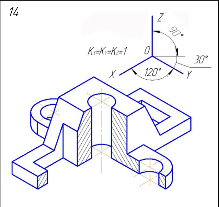 Начертить: а) главный вид детали в соединении с фронтальным разрезом; б) вид сверху; в) вид слева в соединении с профильным разрезом; г) данную аксонометрическую проекцию детали.