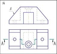 Начертить: а) фронтальный разрез; б) вид сверху в соединении с разрезом А-А; в) вид слева в соединении с профильным разрезом; г) сечение ребра жёсткости Б; д) косоугольную диметрическую проекцию детали с разрезом.