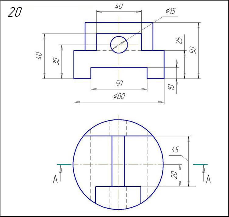 Задание: Начертить: а) главный вид в соединении с разрезом А-А;б) вид сверху; в) профильный разрез;г) прямоугольную изометрическую проекцию детали с разрезом.