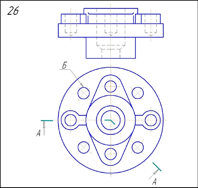 Задание: Начертить: а) разрез А-А; б) вид сверху; в) вид слева в соединении с профильным разрезом. Примечание: 4 отв. Б – сквозные.