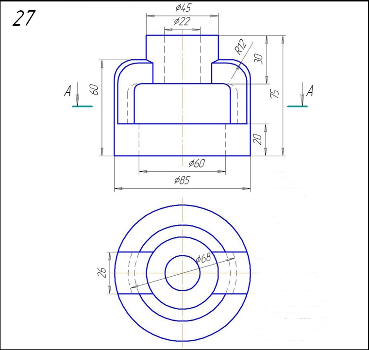 Начертить: а) главный вид в соединении с фронтальным разрезом; б) вид сверху в соединении с разрезом А-А;в) вид слева в соединении с профильным разрезом; г) прямоугольную изометрическую проекцию детали с разрезом.