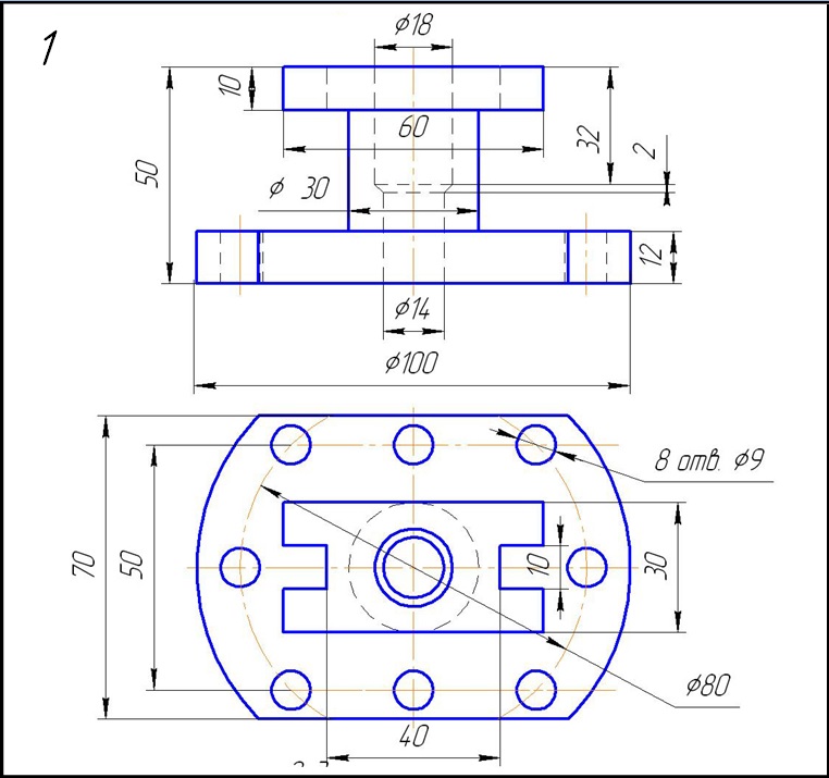 Задание: Начертить: а) главный вид детали в соединении с фронтальным разрезом; б) вид сверху; в) вид слева в соединении с профильным разрезом; г) прямоугольную изометрическую проекцию детали с разрезом.