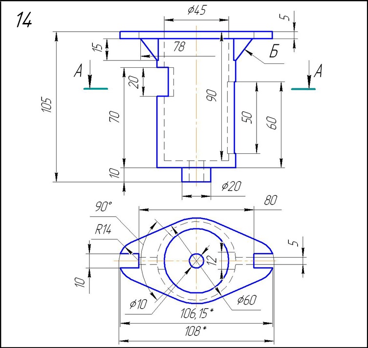 Начертить: а) главный вид в соединении с разрезом А-А; б) вид сверху; в) профильный разрез; г) вынесенное сечение ребра жёсткости Б.