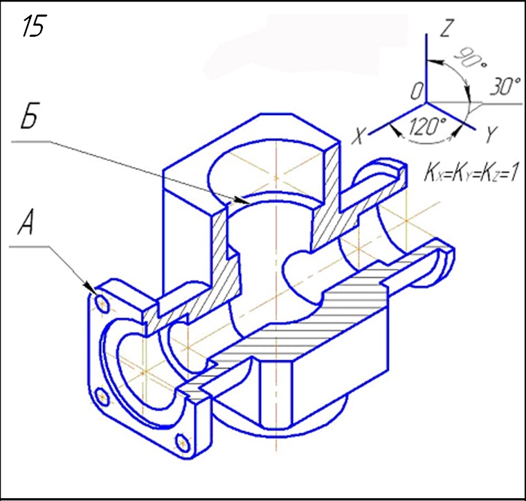 Начертить: а) фронтальный разрез; б) вид сверху в соединении с местным разрезом по оси отв. А; в) вид слева; г) данную аксонометрическую проекцию детали Примечание: а) все отверстия А – сквозные; б) отверстие Б – коническое глубиной 45 мм и конусностью 1:10.