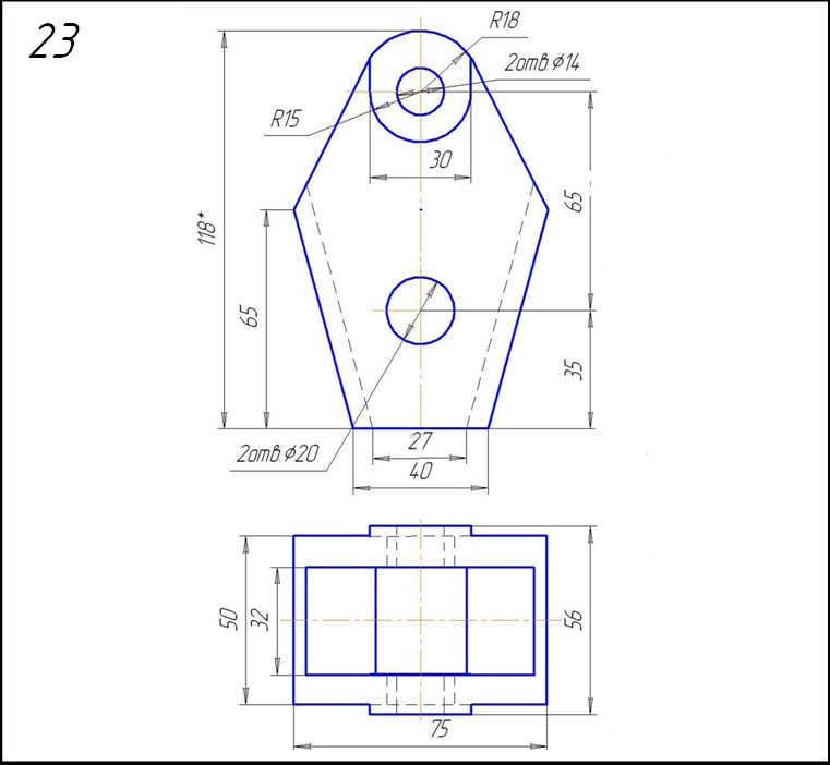 Начертить: а) главный вид в соединении с фронтальным разрезом; б) вид сверху; в) вид слева в соединении с профильным разрезом; г) косоугольную диметрическую проекцию детали с разрезом.