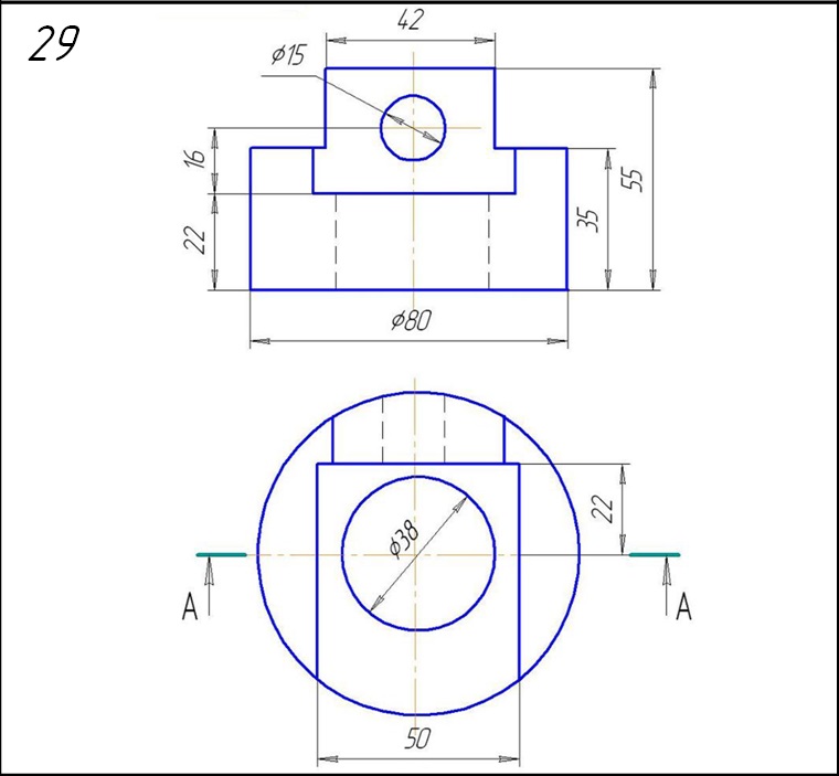 Начертить: а) главный вид в соединении с фронтальным разрезом; б) вид сверху; в) разрез А-А.