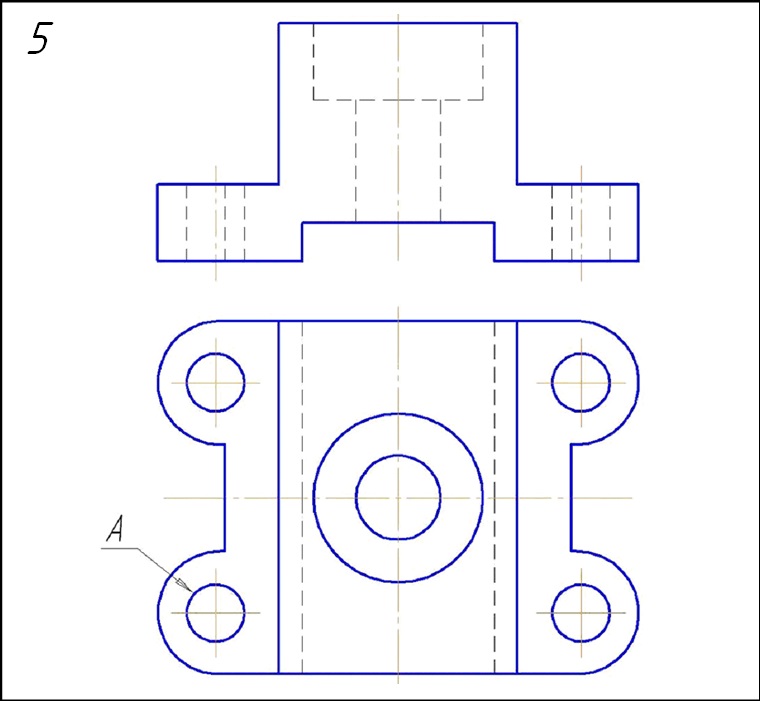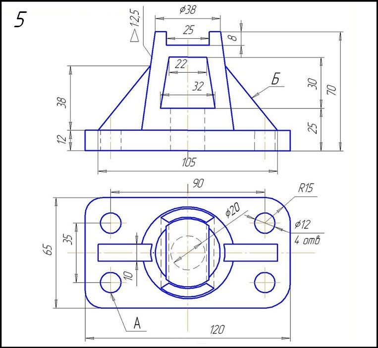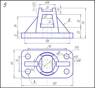 Начертить: а) главный вид детали в соединении с фронтальным разрезом; б) вид сверху; в) вид слева в соединении с профильным разрезом; г) местный разрез по отв. А; д) вынесенное сечение ребра жёсткости Б; е) прямоугольную диметрическую проекцию детали с разрезом.