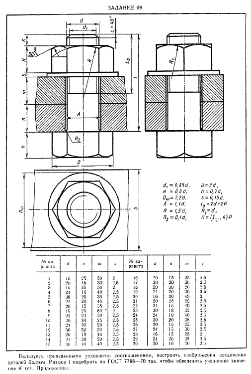 Задание. Пользуясь приведенными условными соотношениями, построить изображения соединения деталей болтом.