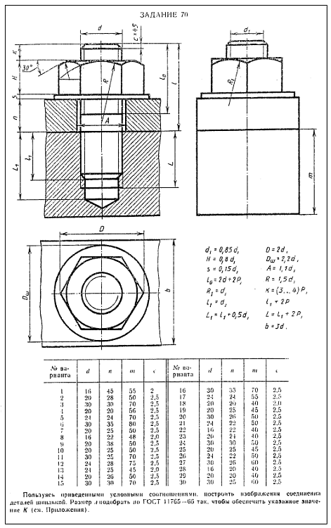 Задание. Пользуясь приведенными условными соотношениями, построить изображения соединения деталей шпилькой.