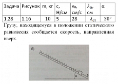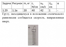 Задание:Груз массой m прикреплен к пружине жесткостью c (рис.1.1). Начальная деформация пружины λ0, начальная скорость груза v0. Найти уравнение движения груза, амплитуду, частоту и период колебаний, наибольшее значение модуля силы упругости. Массой пружины, а так же сопротивлениями движению груза и пружины пренебречь. Начало координат взять в положении статического равновесия груза на пружине. Принять g=10 м/с2.