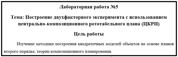 - Лабораторная работа №5. Построение двухфакторного эксперимента с использованием центрально-композиционного рототабельного плана (ЦКРП)